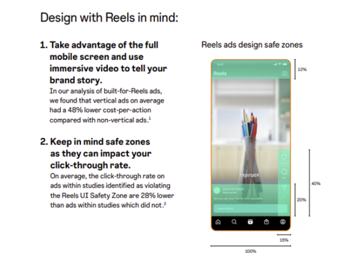 The guide also includes some helpful notes on Reels creation, including pointers on the ‘safe zones’ – i.e. where your content will and won’t be impacted by on-screen display overlays.